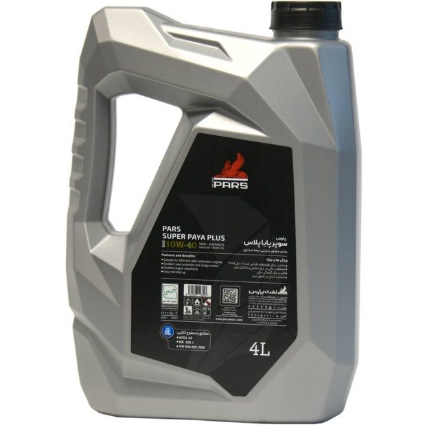 روغن موتور پارس سوپرپایا پلاس مدل 10W40 SL حجم 4 لیتر یک روغن موتور بنزینی نیمه سنتیک است که با مقاومت عالی در برابر اکسیداسیون، سیالیت ایدهآل در دمای پایین و قابلیت پاککنندگی عالی جهت استفاده در انواع موتورهای بنزینی طراحی شده تا سال 2004 میلادی که برای آنها روغن مطابق با سطح کارآیی API SL توصیه شده مناسب می باشد.